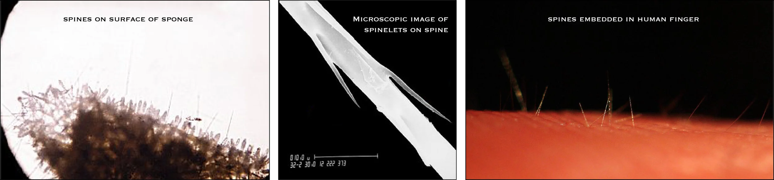 The orientation of the spinelets are reminiscent of those in a porcupine and presumably serve the same purpose. However, these spines do not provide absolute protection against soft bodied animals. We found a brittle star inside a sponge which earlier had been outside. It must have crawled up the outer surface to get in, where it resided for several weeks. Also, there are soft bodied predators on these sponges.